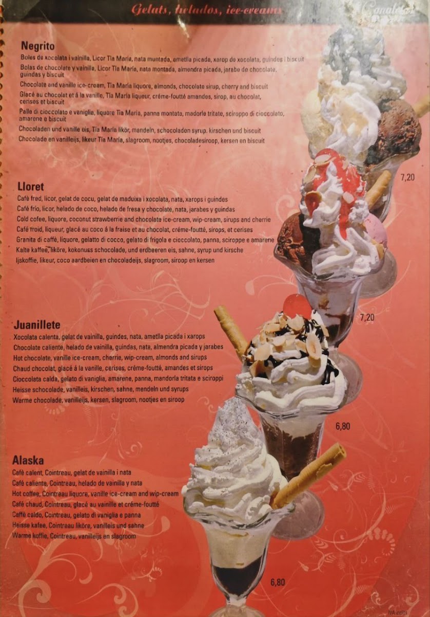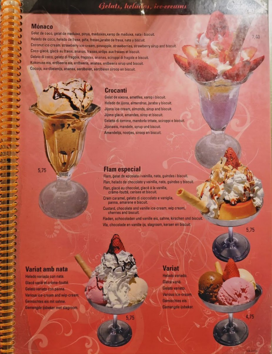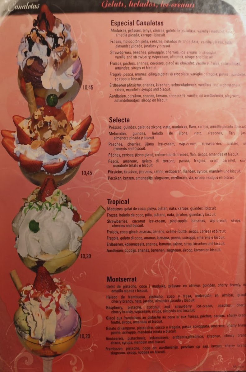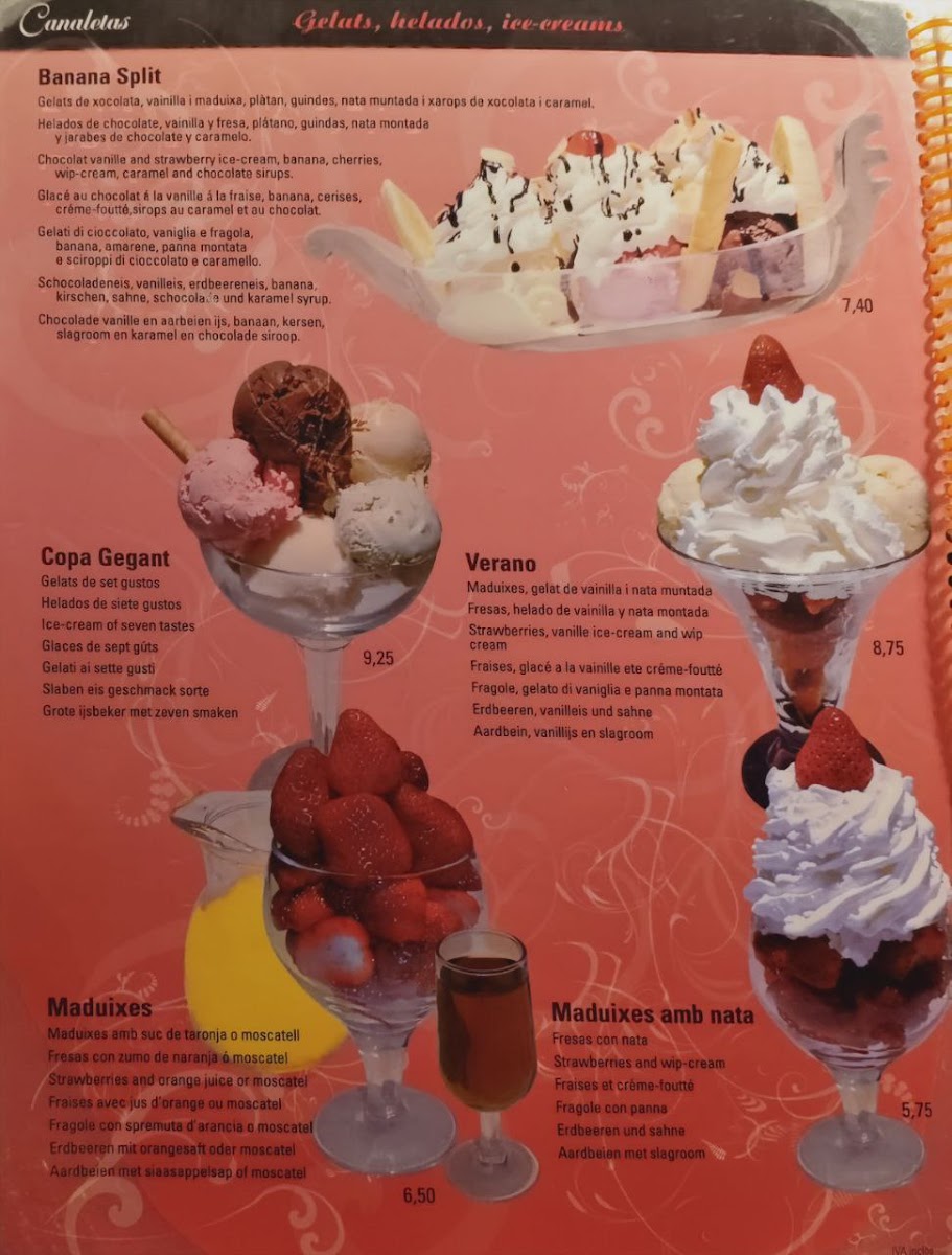 Food selections span from light snacks and tapas to more substantial dishes. The menu features traditional Spanish items like paella and sardines, alongside popular options such as pizzas and calamari. For those with a sweet tooth, a variety of desserts and ice cream creations, including sundaes and milkshakes, are available.